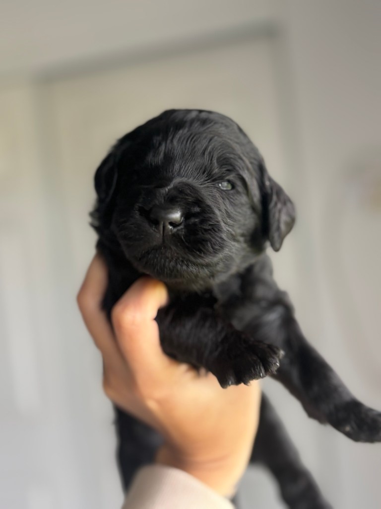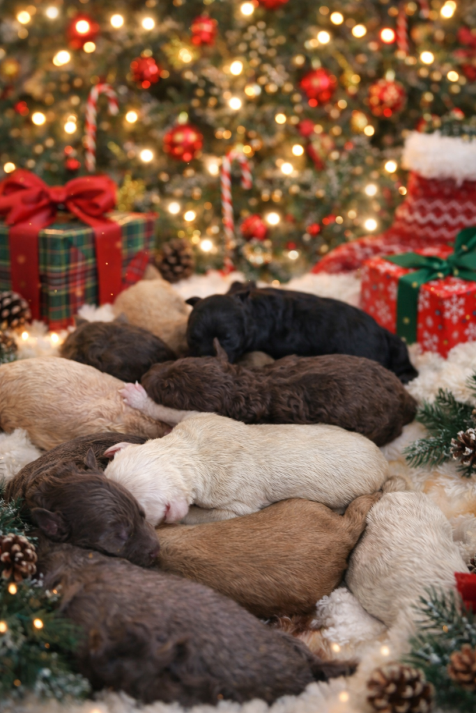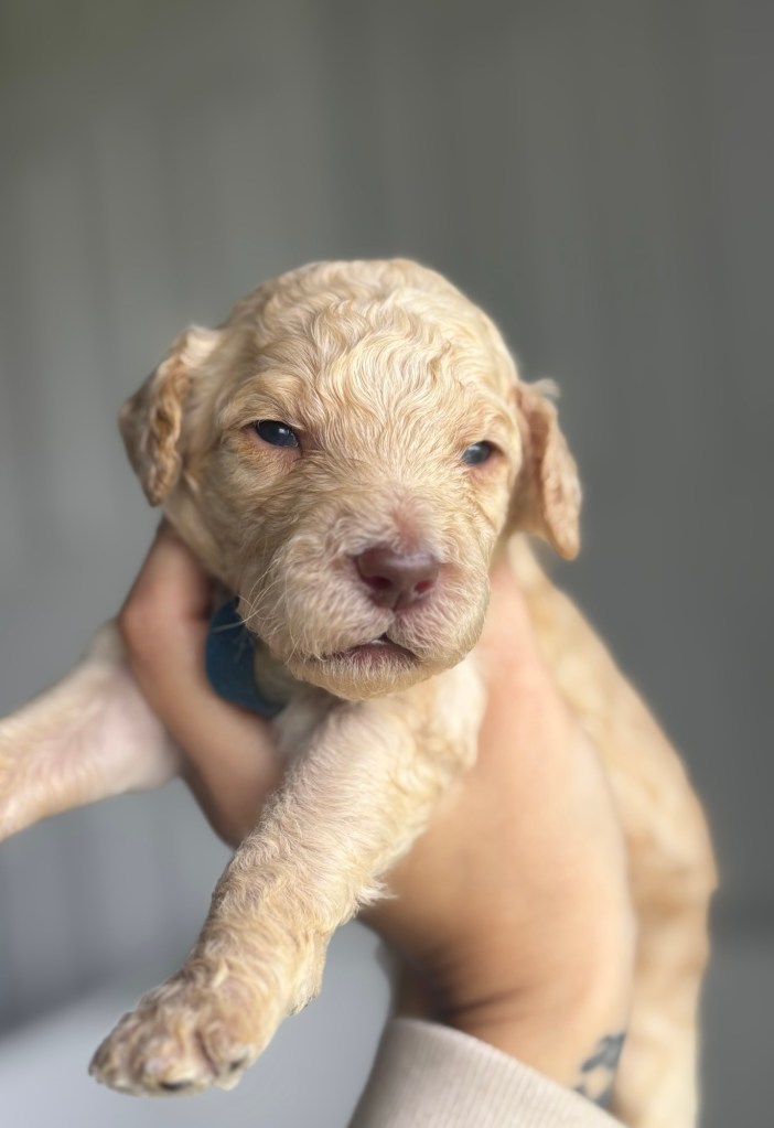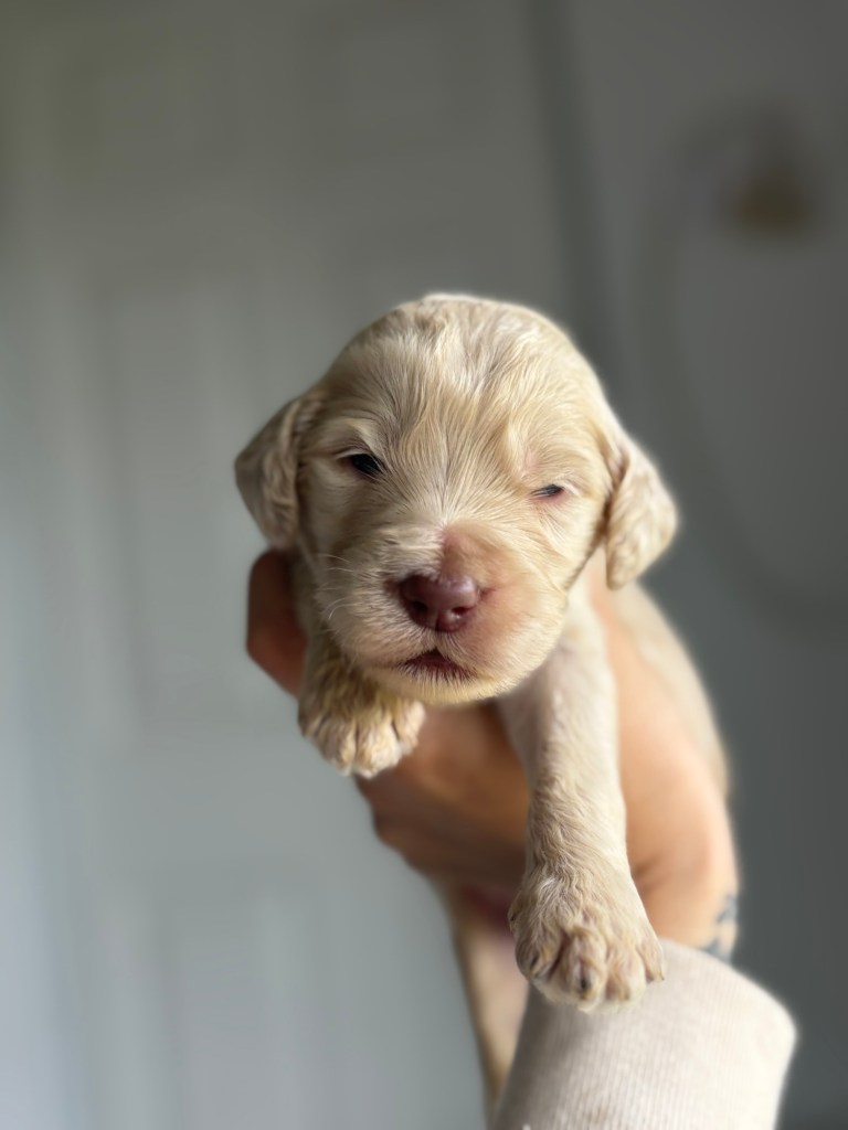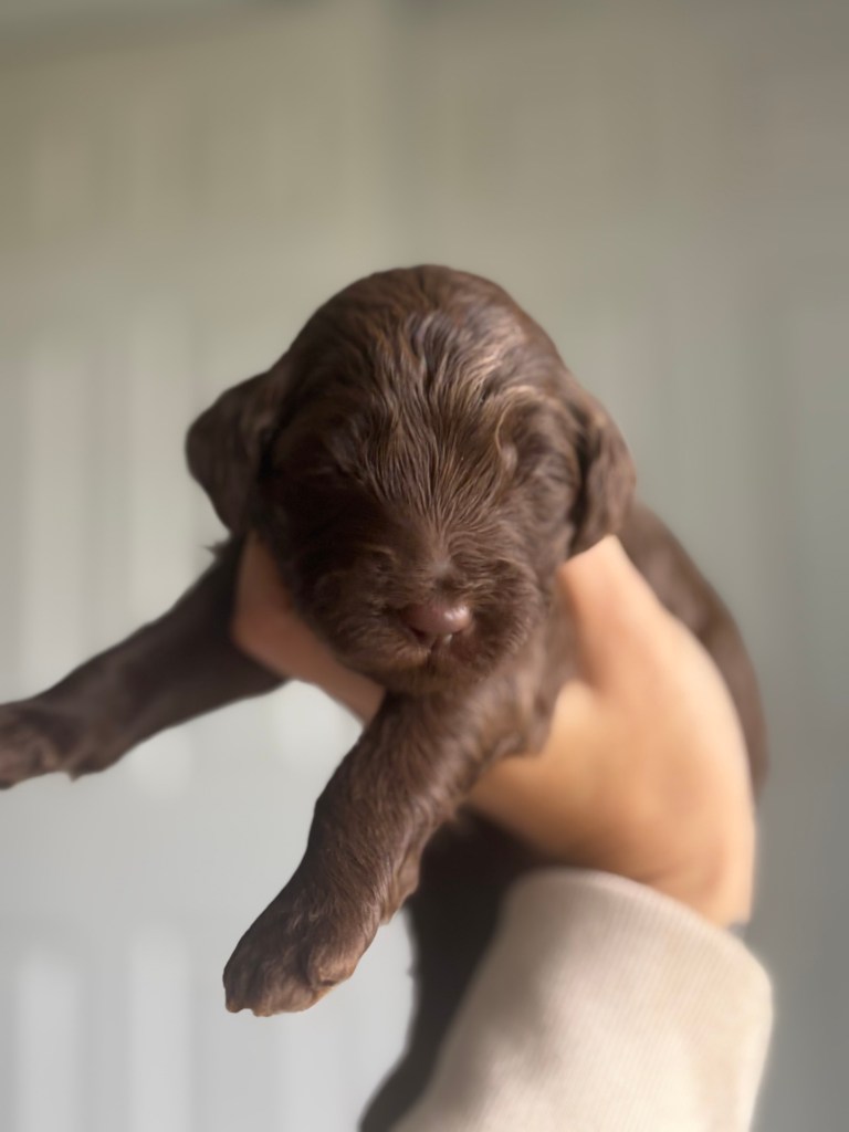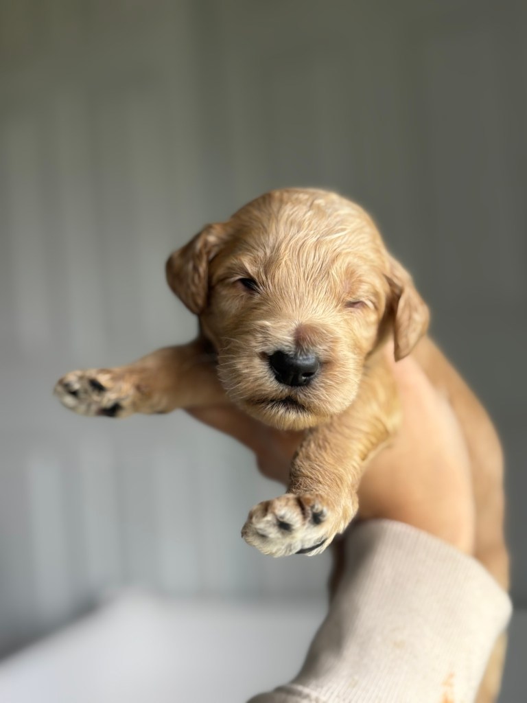 Jazzy will be having her retirement litter with Bingo ! Puppies arrived December 19th and will be ready February 14th . These will be Standard F1bb goldendoodles , both parents are genetically clear with amazing temperaments . Bingo is our daughter’s diabetic alert and mobility service dog who has been OFA hip and patellas tested . All pups will be evaluated by our trainer to help pick out our service/therapy quality pups . We are expecting chocolate , black and apricots/cream pups with wavy and curly coats . Pups will be $$2500.