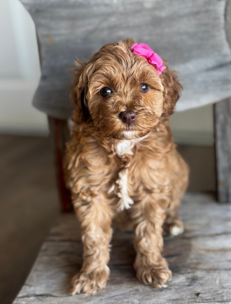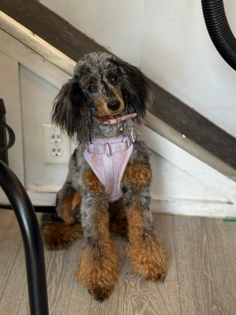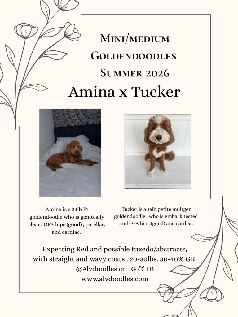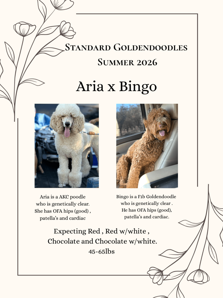 Riya our 10lb mini poodle who’s genetically clear , produced 5 beautiful babies with our 16lb petite Multigen goldendoodle Tucker , who’s also genetically clear and has excellent OFAs . These puppies were born March 2nd and ready to go home April 27th . Puppies will be high percentage poodle with non shedding wavy and curly coats , weighing in at 10-15lbs at maturity . Puppies will be $3200 . This is pet price only .